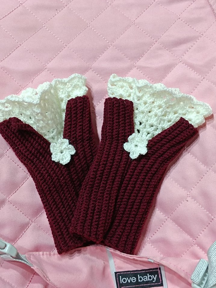 Beyaz dantel süslemeli, çiçek detaylı bordo örgü eldivenler. "love baby" yazısı bulunur, sıcak ve şık bir tasarım sunar.