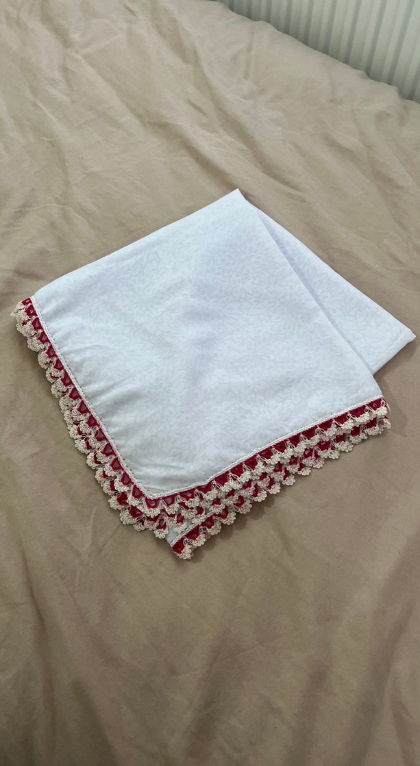 Beyaz tekstil fular, kenarlarında dantel detayına sahip olup sade ve rahat bir tarz sunar. Temel, sade görünüm için uygundur.