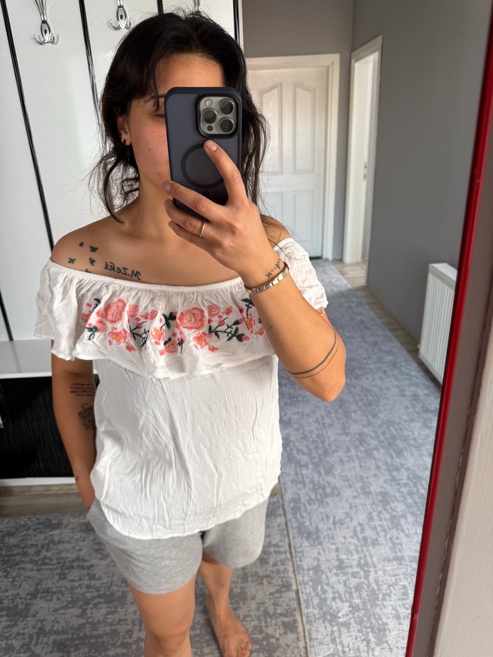 Pamuk kumaştan, dantel detaylı ve çiçek baskılı beyaz straplez, kısa kollu, bol kesim bluz. Rahat günlük sokak stili için uygun.