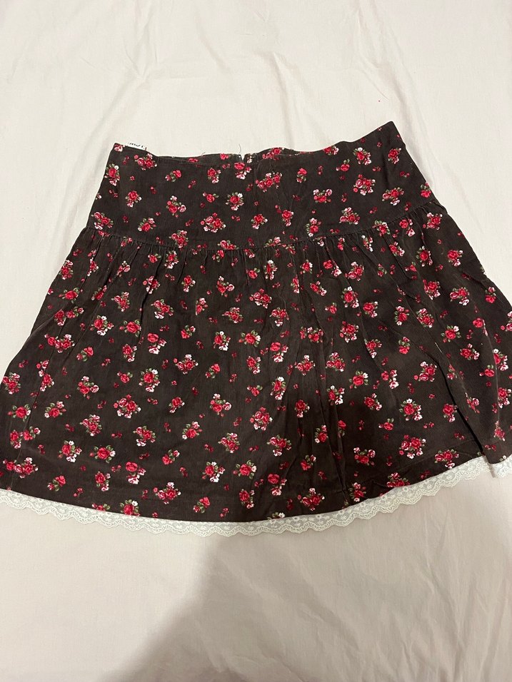Koyu kahverengi pamuklu, çiçek desenli ve dantel detaylı bol kesim midi etek, romantik buluşmalar için uygundur.