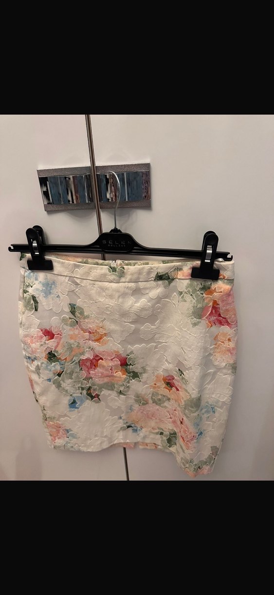 Dantel detaylı, çiçek desenli ve hafif renkli kumaştan yapılmış, bohem tarzda, günlük kullanıma uygun fitted mini etek.