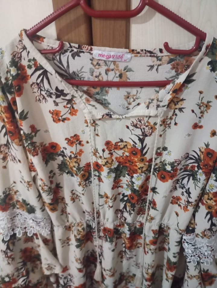 Dantel detaylı, V yaka, uzun kollu bohem mini bluz. Hafif çiçek desenli yumuşak dokulu kumaştandır, günlük kullanıma uygundur.