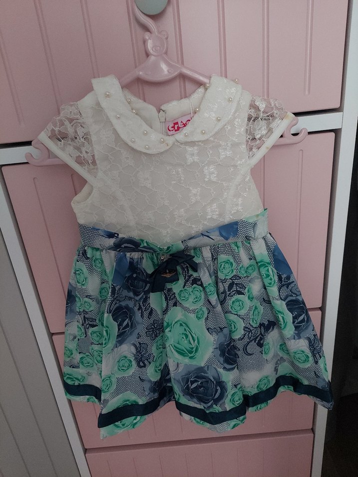Kolsuz, dantel üst ve çiçek desenli etek kısmı olan kız elbisesi. Yaka detaylı ve vücuda oturan kesimde, yumuşak sentetik kumaştan yapılmıştır. Pastel renklerde bohem tarz.