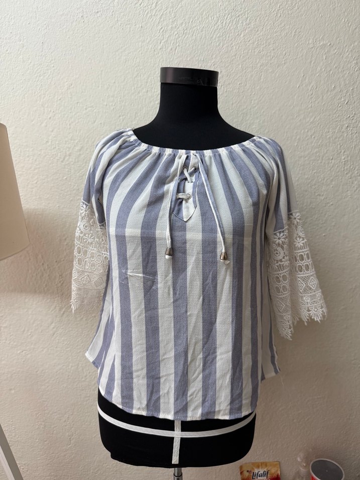 Pamuklu, bol kesim, tekne yaka ve kısa kollu bluz. Kollarında dantel detayları ve gri beyaz çizgili deseniyle günlük kullanıma uygun.