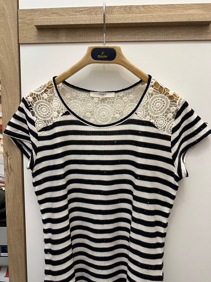 Dar kesim, kısa kollu, yuvarlak yaka, zebra desenli ve omuzlarda dantel detaylı triko tişört. Trend sokak stili için uygun. Parks bravo 34 beden