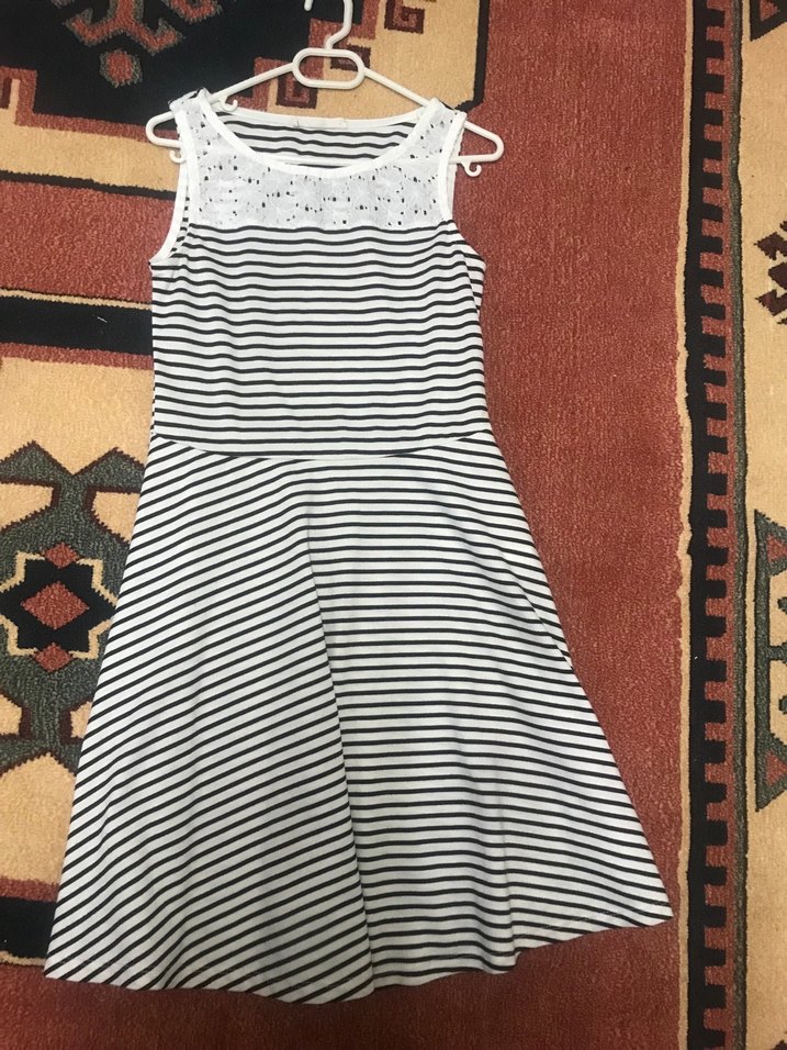 Dantel detaylı, çizgili ve kolsuz midi elbise. Tekne yaka ve vücuda oturan kesimiyle günlük kullanıma uygun, yumuşak sentetik kumaştan.