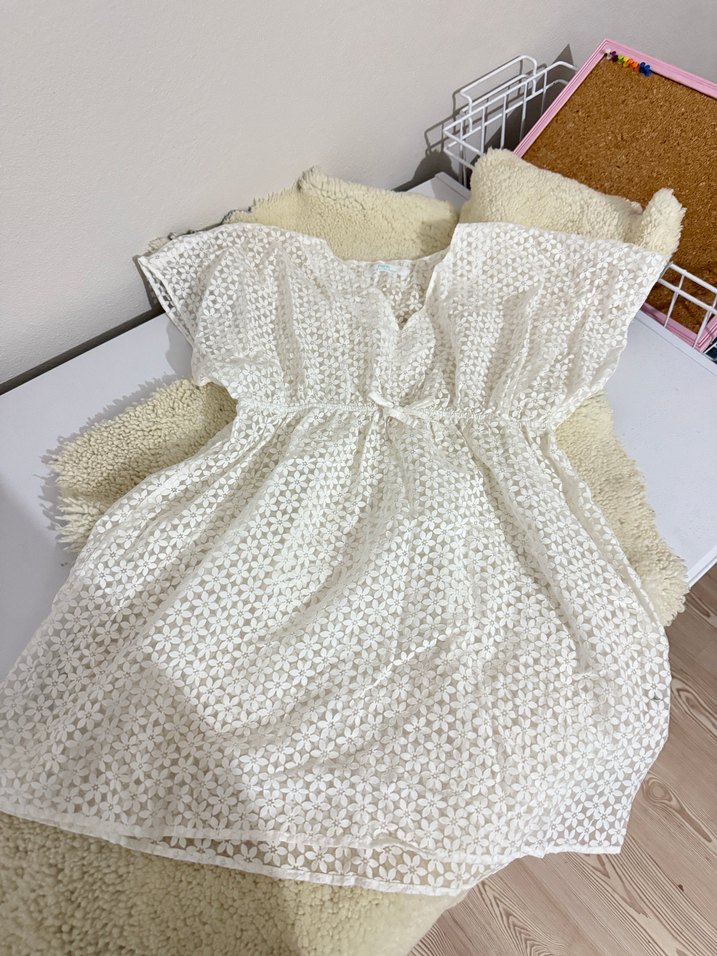 Dantel ve nakış detaylı beyaz pareo , V yaka ve kısa kollu. Yumuşak pamuktan, rahat ve bol kesim, günlük kullanım için uygundur. 14-15 yaş