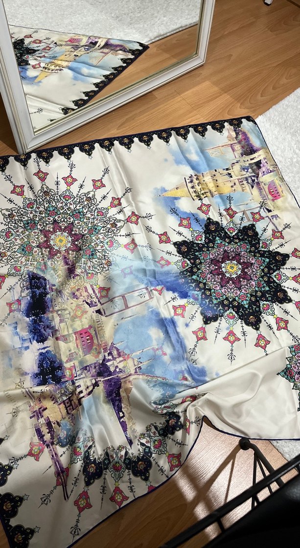 İpek dokulu, çok renkli bohem desenli, dantel detaylı hafif eşarp Retro ve hippie tarzları yansıtır.