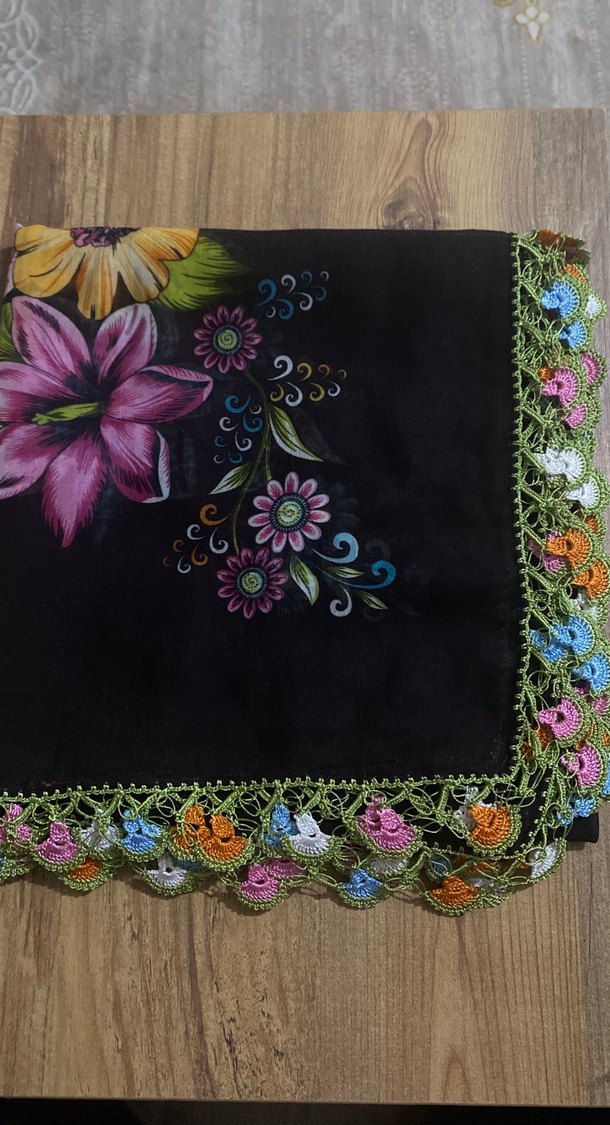 Kadınlar için çok renkli çiçek desenli, koyu zeminli ve dantel detaylı bohem tarzı fular.