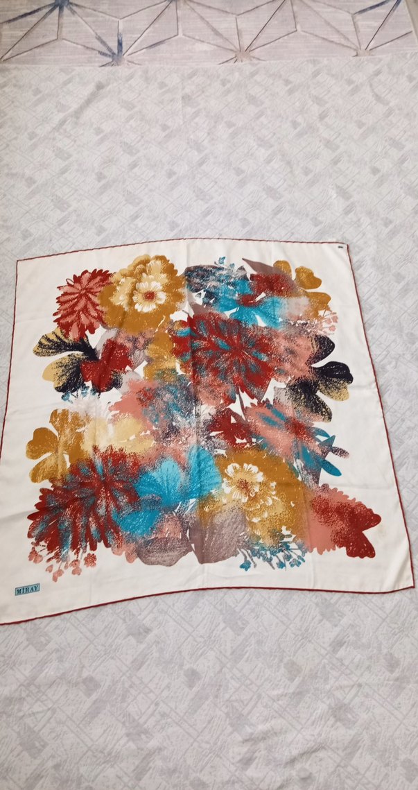 Çiçek desenli çok renkli kadın fular, dantel detayları ve yumuşak tekstil kumaşıyla bohem tarzda tasarlanmıştır.