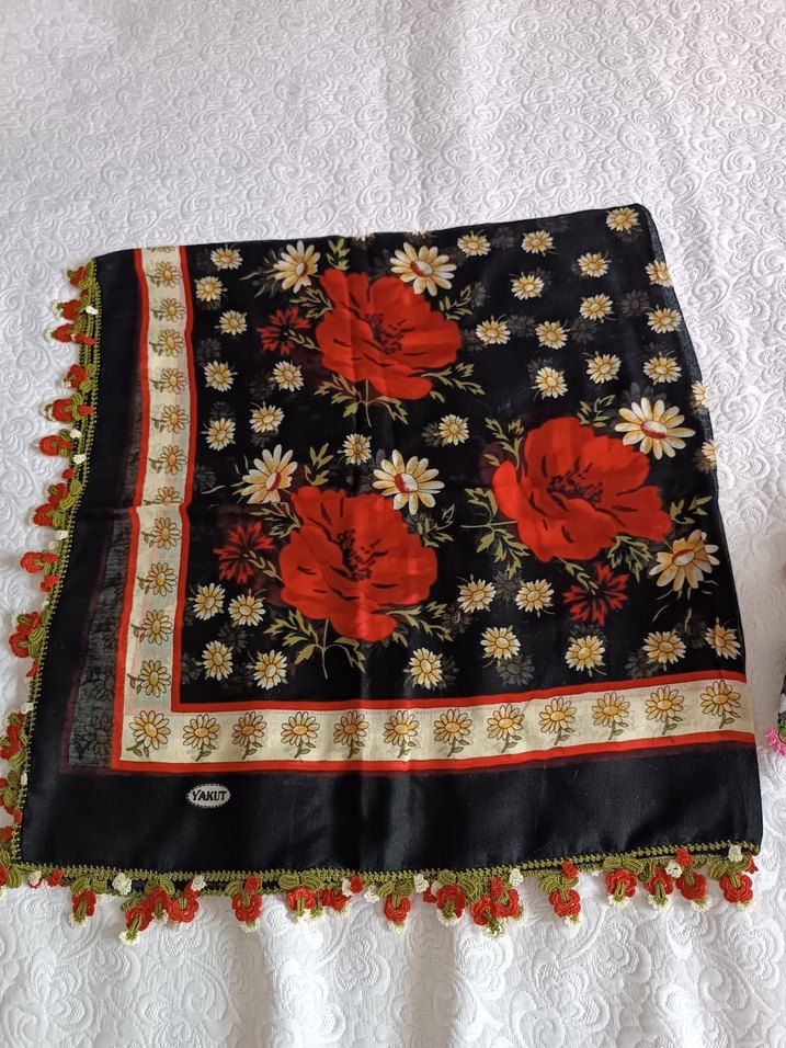 Kadın fular, koyu renkli çok renkli çiçek desenleri ve dantel süslemeleriyle bohem tarzını yansıtıyor.