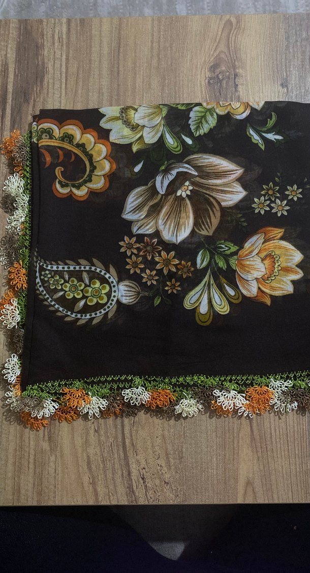 İğne oyasıdır.Çok renkli çiçek desenli, koyu zeminli ve dantel işlemeli bohem tarz kadın fular. Yumuşak tekstil kumaştan yapılmıştır.