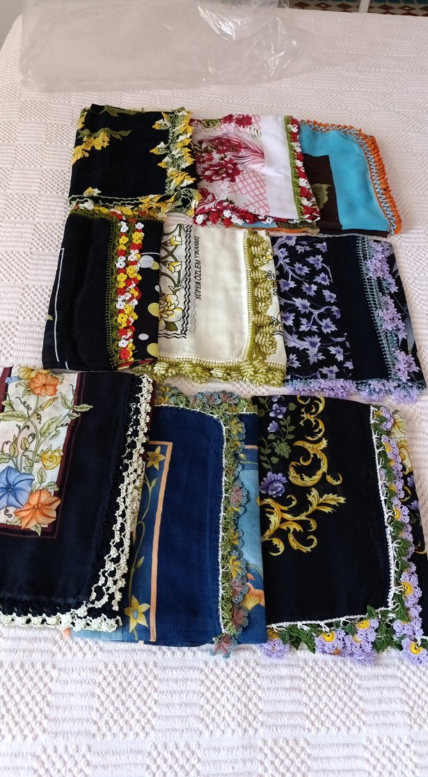 Dantel detaylı, koyu ve canlı renklerde çok renkli kadın fuları, bohem, retro ve hippie tarzında.