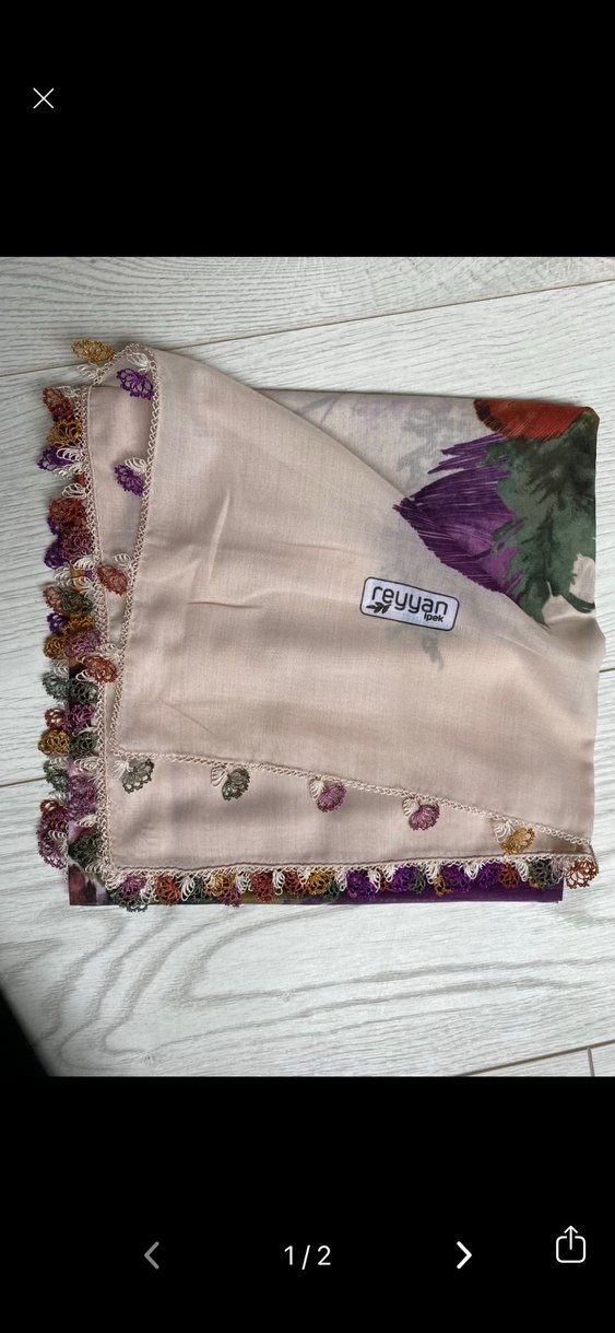 Bu kadın fuları, pastel çok renkli kumaş ve ince dantel kenar detaylarıyla bohem tarz sunar. Üzerinde 'Reyyan' etiketi bulunmaktadır. İğne oyası yazma #çiçek #iğneoyası #reyyan #çeyiz #bohça #çiçek #yazma #eşarp #damat #gelin #kadın