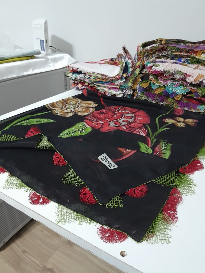 Çiçek desenli, dantel kenarlı çok renkli tekstil malzemeden bohem tarzda kadın fularıdır. Retro ve hippie havası taşır.