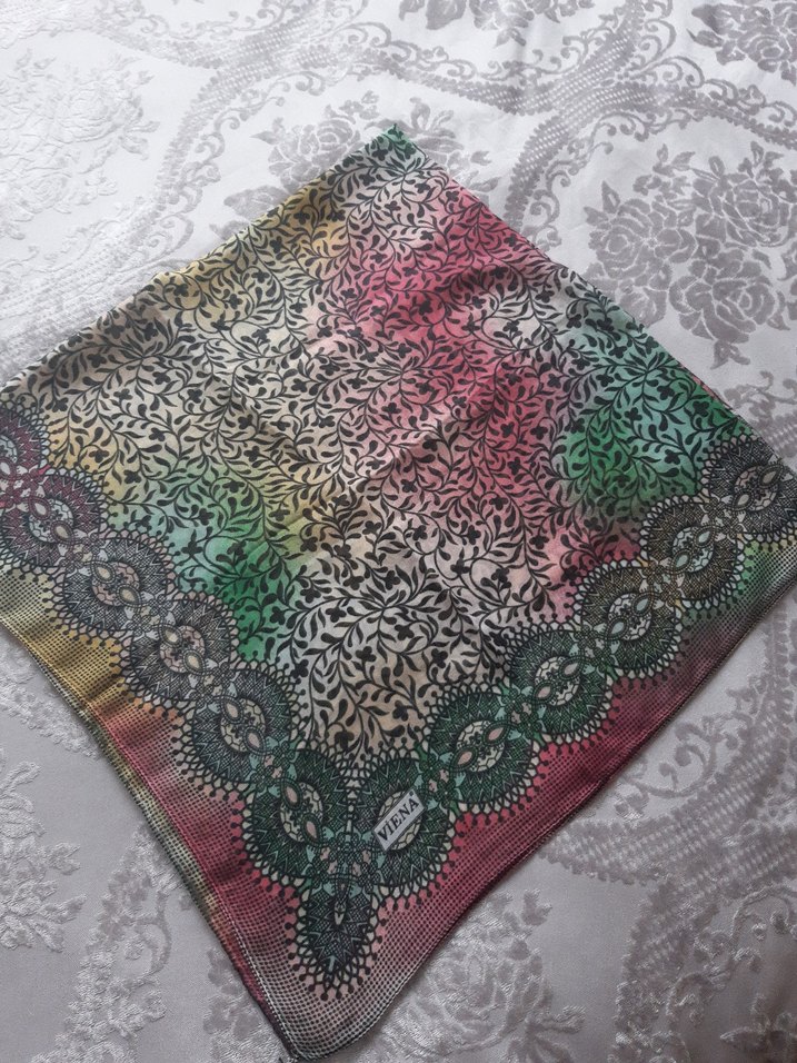 Dantel detaylı, koyu çok renkli desene sahip kadın fuları. Yumuşak sentetik kumaştan, bohem ve retro tarzlara uygun.