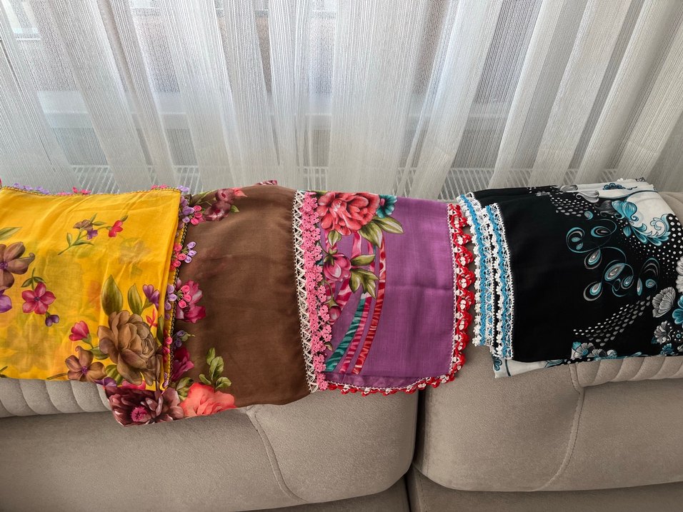 Kadınlar için çok renkli çiçek desenli tekstil fular, dantel kenar detaylarıyla bohem tarzını yansıtıyor. Koyu canlı renkler ve ince dantel, retro ve hippie havası katıyor.