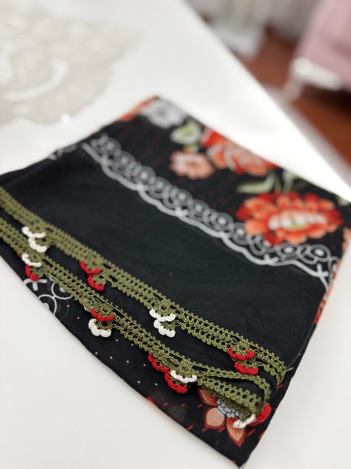 Çok renkli ve koyu tonlarda, dantel detaylı bohem desenli kadın fularıdır. Hippie ve retro tarzlar için uygundur.