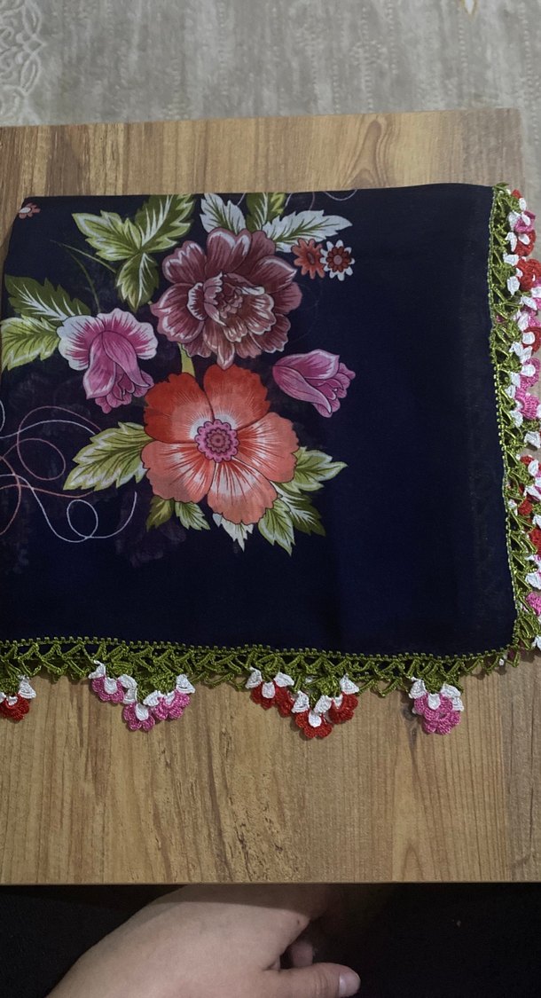 Kadın fular, koyu renkli çok renkli çiçek desenine ve dantel detaylı kenarlara sahiptir. Yumuşak tekstil malzemeden yapılmıştır, bohem tarzına uygundur.