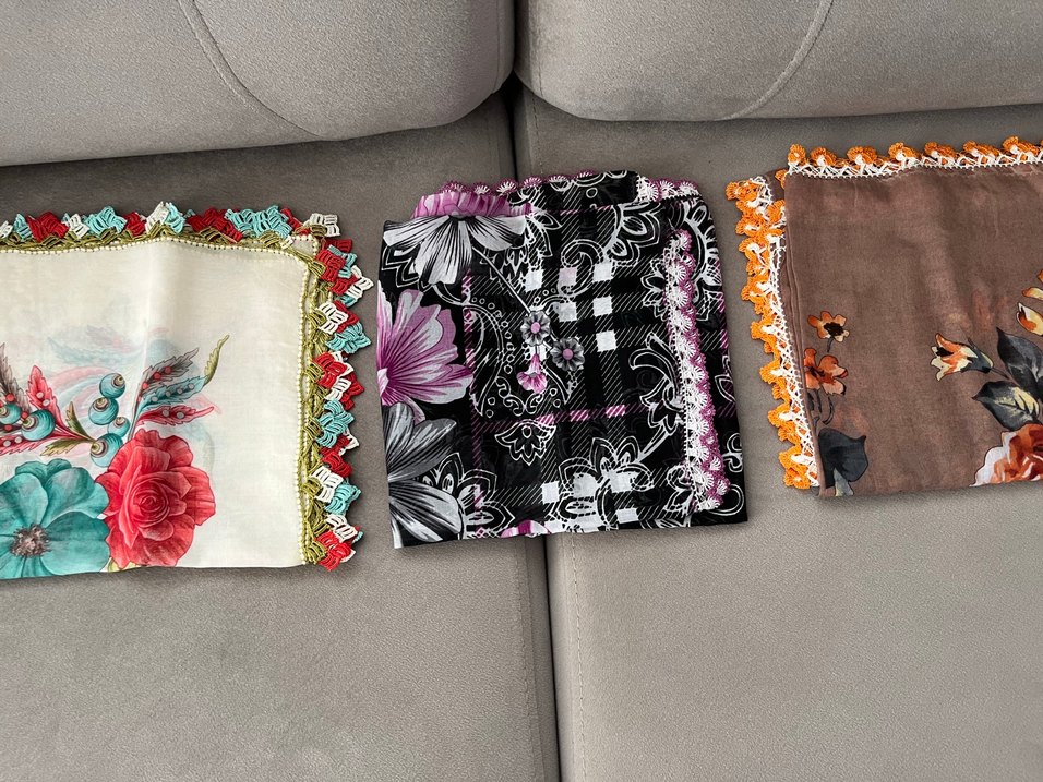 Kadınlar için çok renkli, dantel detaylı tekstil fular. Bohem ve retro tarzı yansıtan koyu tonlarda çiçek ve kare desenli bir şal.