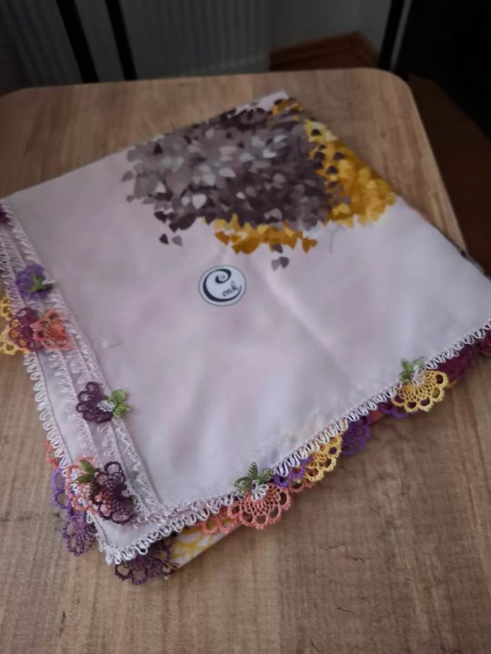 Dantel işlemeli, gri, mor ve sarı tonlarında çok renkli bohem stilde kadın fularıdır. Yumuşak tekstil kumaştan üretilmiştir.