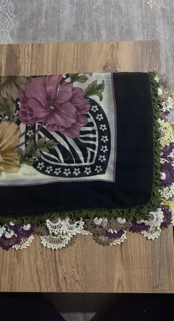Kadın fuları, çok renkli tekstil kumaş ve dantel kenarlarla bohem tarzını yansıtıyor. Koyu tonlar ve çiçek desenleriyle hippie ve retro stillere uygun.