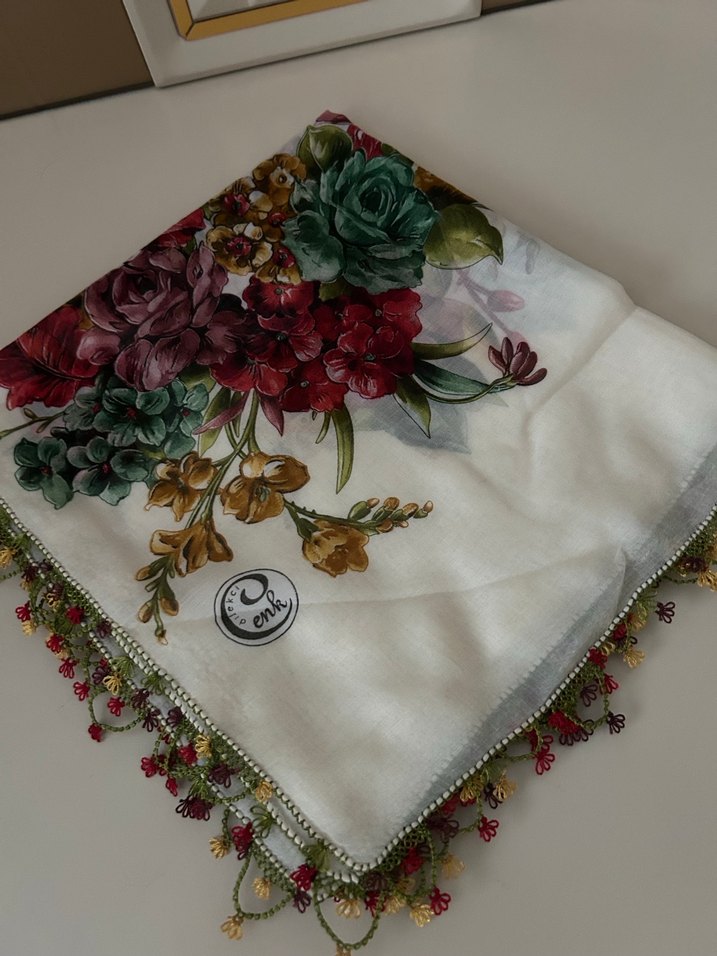 Bohem tarzda kadın fular, çok renkli hafif çiçek desenli tekstil ve dantel detaylı kenarlarla retro ve hippie havası taşıyor.