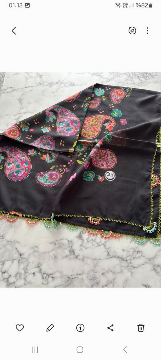 Koyu zemin üzerine çok renkli paisley desenler ve ince dantel detaylarıyla bohem tarzda kadın igne oyasi yazma.