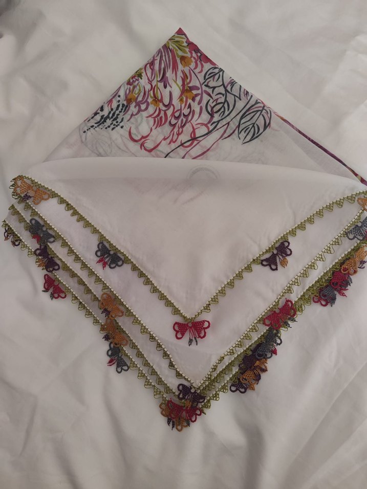 Hafif çok renkli, dantel kenarlı bohem tarzı kadın yazma. Yumuşak tekstil malzemeden, zarif çiçek desenleriyle.
