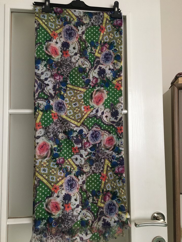 Çiçek ve geometrik desenlerle çok renkli, dantel detaylı bohem ve retro tarzda kadın şalı. Hippie stiline uygun bir aksesuar.