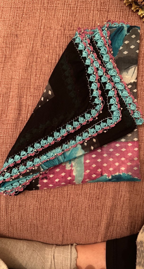 Kadın şalı, çok renkli tekstil ve kenarlarında dantel detaylarıyla bohem tarzını yansıtıyor. Canlı ve retro bir görünüm sunar.