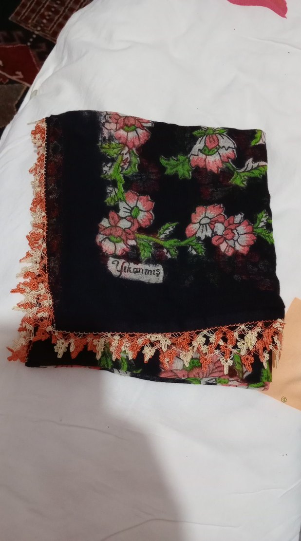 Çiçek desenli çok renkli kadın fuları, dantel detaylı ve yıkanmış yumuşak tekstil kumaşından yapılmıştır. Bohem ve retro tarzlara uygundur.