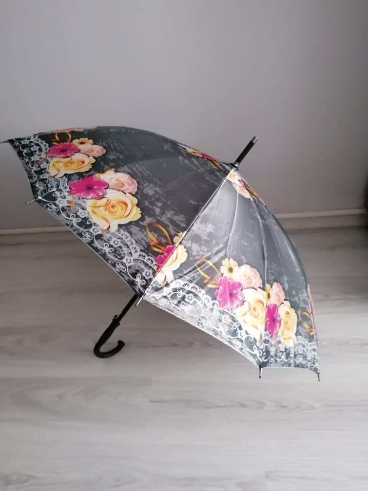 Gri taban üzerinde çok renkli çiçek desenleri ve zarif dantel detaylarıyla klasik ve bohem Paris tarzını yansıtan kadın şemsiyesi. 12 telli