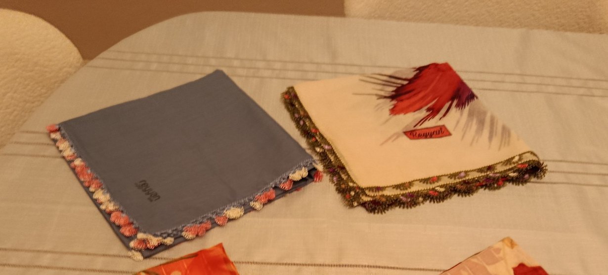 2 adet iğne oyası Dantel kenarlı, çok renkli kumaştan vintage tarzda kadın fularları, geleneksel desenlere sahip.