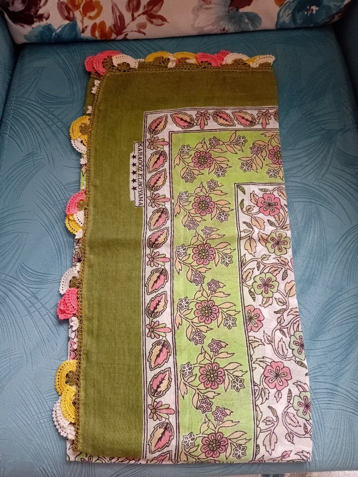 Kadınlar için çok renkli pastel tonlarda, çiçek desenli ve dantel kenarlı yemeni
