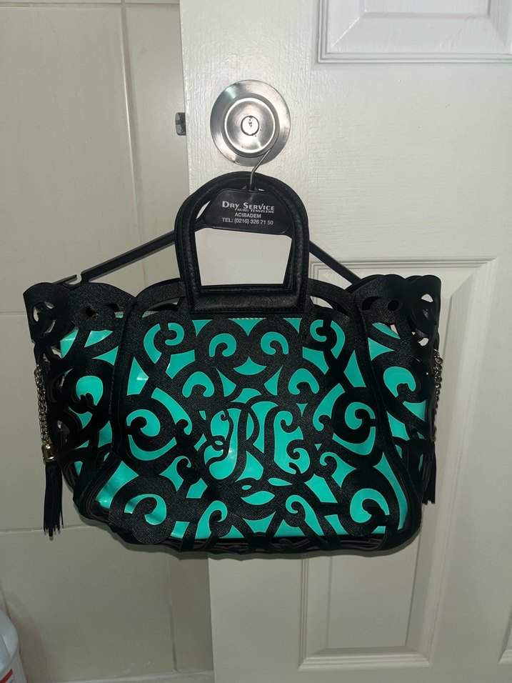 Su yeşili renkli ,dantel detaylı ve gotik tarzda çanta. Püskül aksesuarları ve baskılı deseniyle dikkat çekiyor.❤️