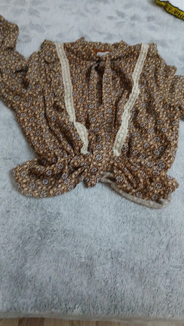 crop dantel detaylı, uzun kollu, V yakalı, bol kesim, kahverengi batik desenli yumuşak örme crop