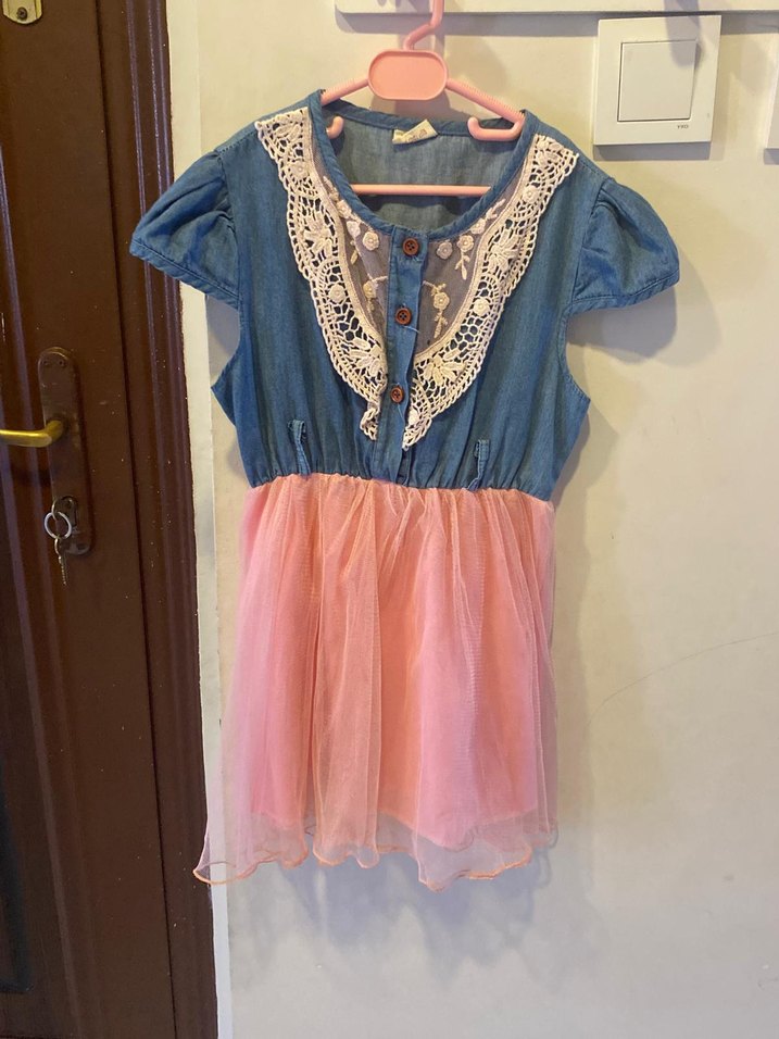 Kısa kollu, straplez yakalı, bol kesim kız elbisesi. Denim üst kısmı, pastel pembe akışkan etek ve dantel detaylarıyla bohem tarzı yansıtıyor.