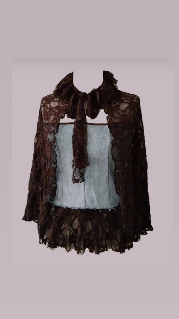 denim kahve dantel etek ucu straplez korse, dantel detayları ve bol kesimiyle gotik ve bohem tarzını bir araya getirir. pelerinli aynı kumaştan dantel denim yapılmıştır. Kendi marka ürünümdür. M beden Uyumludur.