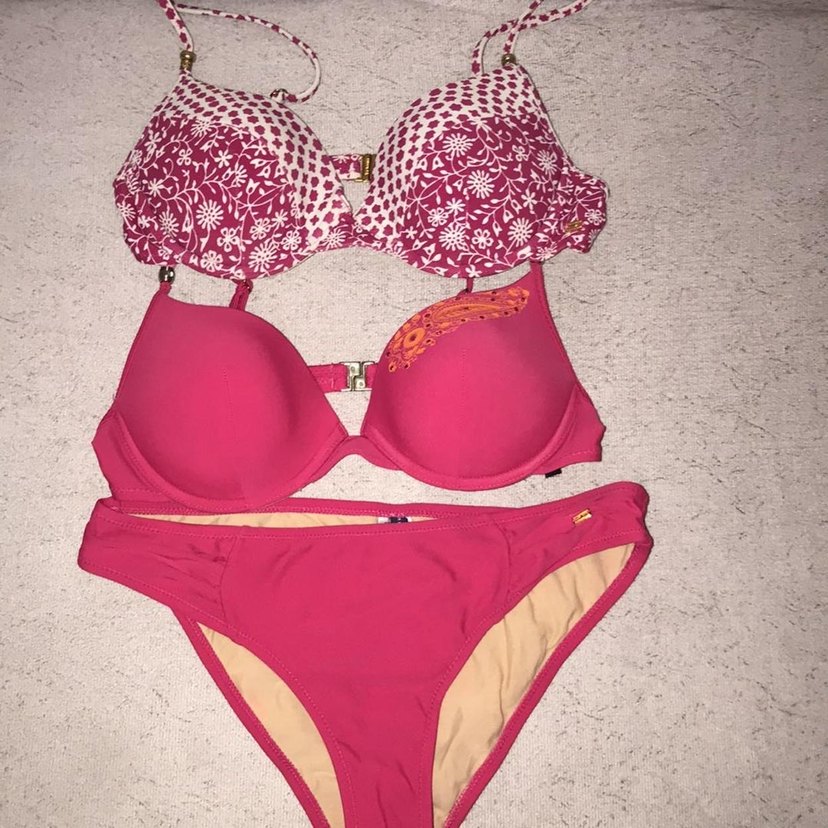 Dantel detaylı, desenli ve renkli bohem tarzda, askılı ve vücuda oturan kadın bikini. Plaj için uygun. Orjinal tommy