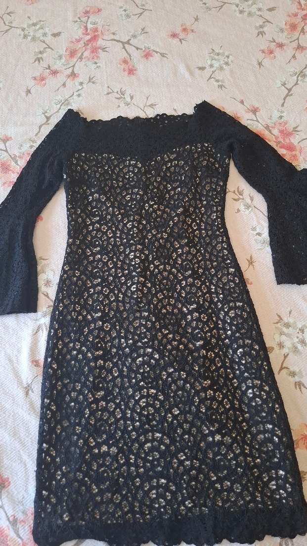 Dantel detaylı, siyah elbise, tekne yaka ve dar kesimiyle klasik ve zarafeti bir araya getirir. Bir kere giydim.