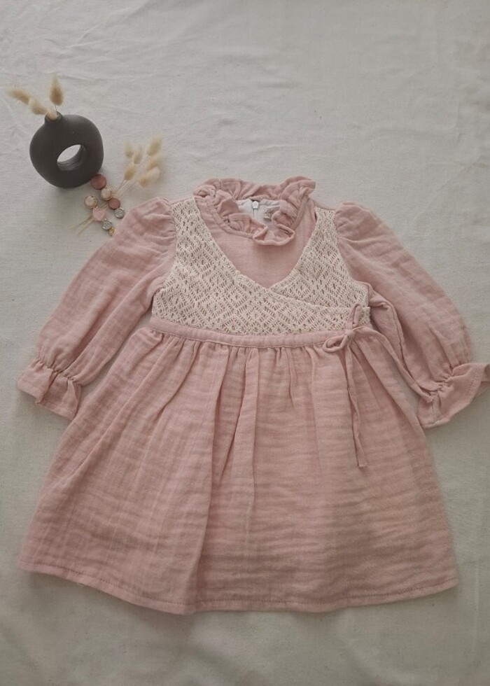 Organik dantel detaylı müslin elbisemiz miniklerimize çok yakışacak Pembe renk yeni etiketledi efendim