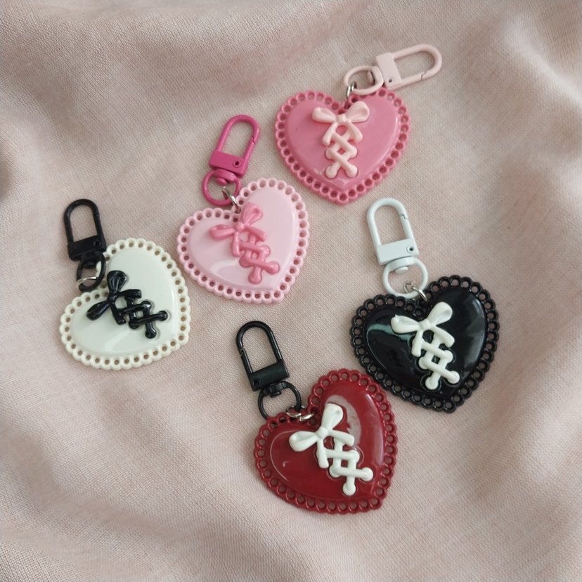 Pastel pembe renkte, dantel bağcık detaylı kalp şeklinde gotik stil anahtarlık. Kolay takma için klips içerir.