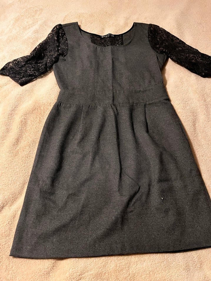Dantel uzun kollu, bisiklet yaka, gri renkli, fitted kesim elbise. Ofis için uygun, rahat goth tarzını yansıtıyor.