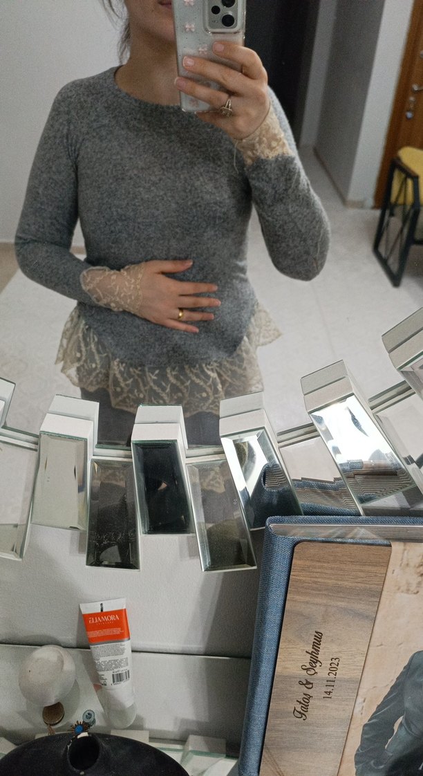 Gri triko kumaştan, dantel detaylı uzun kollu, normal boyda, dar kesim hamile süveteri. Rahat ve şık, yuvarlak yaka ile günlük kullanım için uygundur.