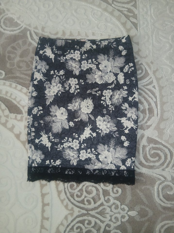 Gri çiçek desenli, dantel detaylı, vintage esintili ve günlük kullanıma uygun oturan hamile eteği.