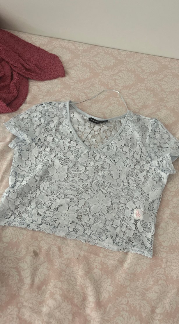 Dantel detaylı, kısa kollu, V yaka, gri renkli, vücuda oturan kadın tişörtü. Günlük kullanıma uygun rahat bir model.