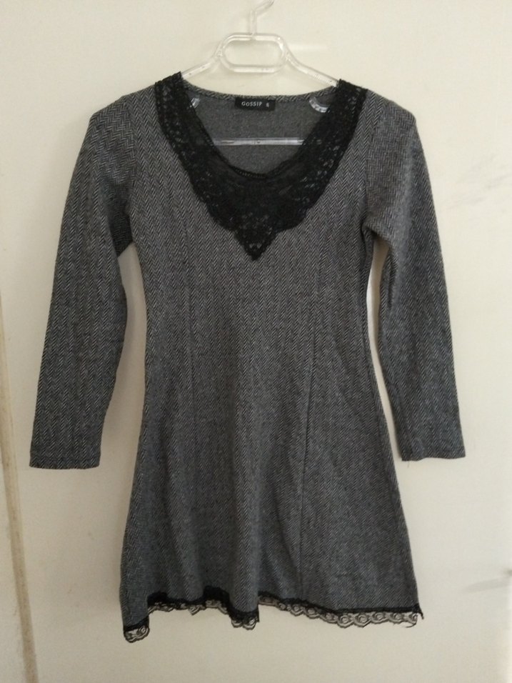 Dantel detaylı V yaka ve uzun kollu, gri triko kumaştan yapılmış, midi boyda, vücuda oturan elbisedir.
