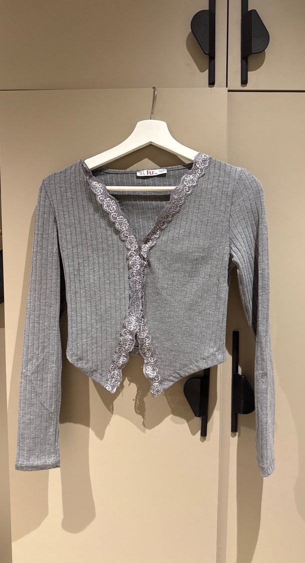 Uzun kollu, V yakalı ve dantel işlemeli gri kadın hırka. Yumuşak örme kumaştan, kısa ve mini boyda, rahat sokak stiline uygun.