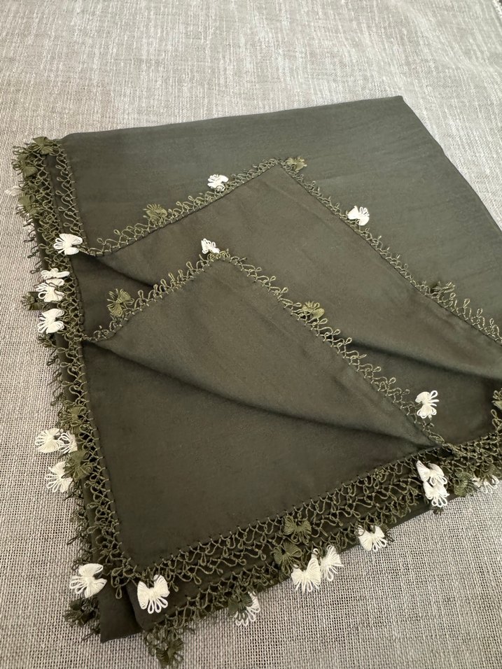 Haki renkli kadın fular, ince dantel kenarları ve küçük beyaz çiçek detaylarıyla bohem tarzını yansıtıyor. Yumuşak tekstil kumaştan üretilmiştir.